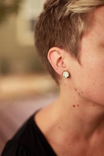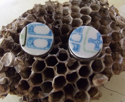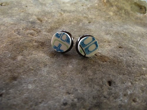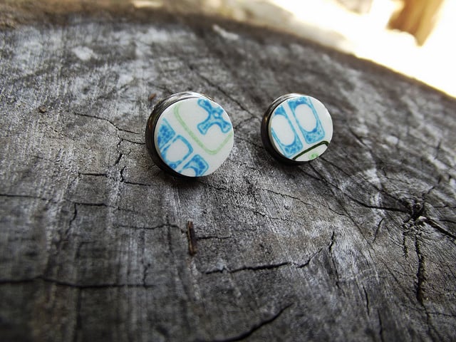 "Atomic Ear" are post style earrings handcrafted using a vintage 1960's recycled broken plate. Perfectly cut ,sanded and set in small 1/4 inch brass bezel posts.